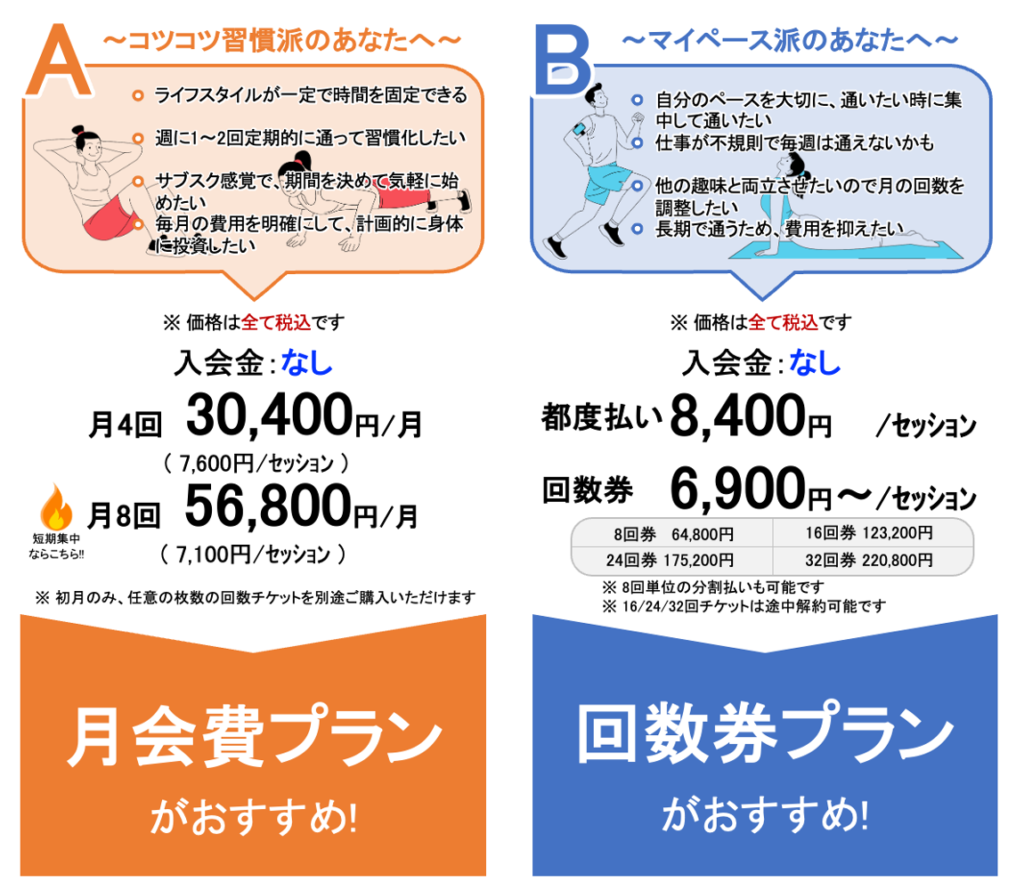 16回以上の回数券、2ヶ月パックは分割払いも可能です。安心の途中解約制度もございますので、詳細は価格ページをご参照ください。